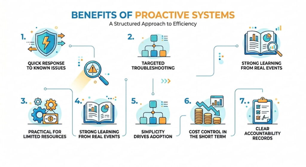 - Strong learning from real events — Each incident adds useful data. Root cause analysis reveals gaps. Repeat problems often drop after documentation improves;