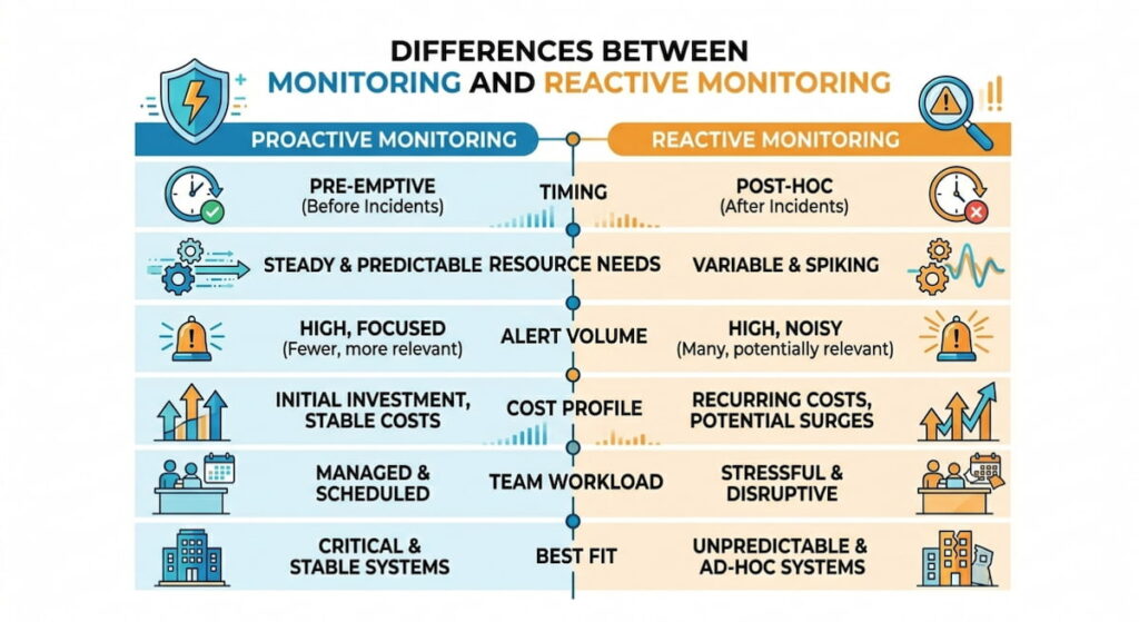 - Compared to proactive monitoring, reactive approaches accept some downtime but require fewer resources upfront and suit stable or legacy systems well;